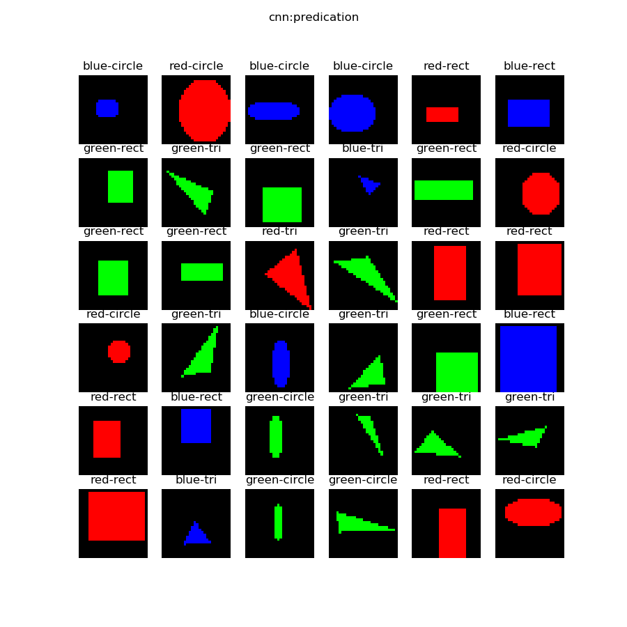 绝大部分样本预测是正确的,但是第3行第2列的样本,应该是green-rect,被预测成green-circle;最后两行的两个green-tri也被预测错了形状,颜色并没有错。